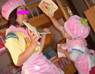 ねぇねとゆぅたんはお揃いのカフェの店員さん風パティシェエプロンをプレゼント